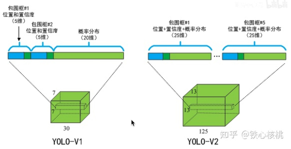 v1中每个gridcell就30个参数,而v2中则有(20+4+1)*5=125个数,每个anchor各自负责类别分类。