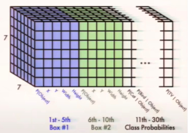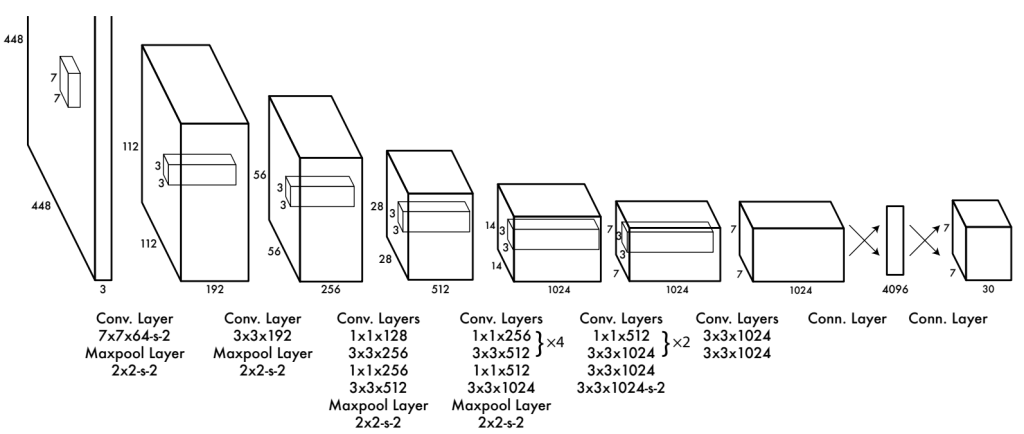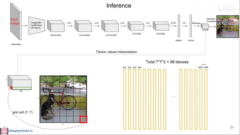 输入一个448*448*3的图像,经过一系列的卷积和池化操作,得到一个7*7*1024的feature map,将其拉平,送入4096个神经元的FC层中,输出结果输入到1470(7*7*30)个神经元的FC层中,输出1470维向量,reshape成7*7*30的tensor。