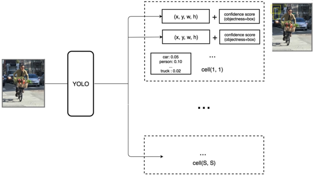 why7*7*30?论文中将图像划分为S*S个网格,这里S取7。每个grid cell(网格)可以预测出B个bounding box(预测框,包含x,y【中心坐标】,h,w【宽高】,c【置信度confidence,包含物体的概率,用框线粗细表示,粗的置信度高】),这里B取2。30=2*5+20。2:2个框;5:5个参数;20:Pascal VOC中20个类别的条件概率(该grid cell在包含物体情况下是xx的概率)。