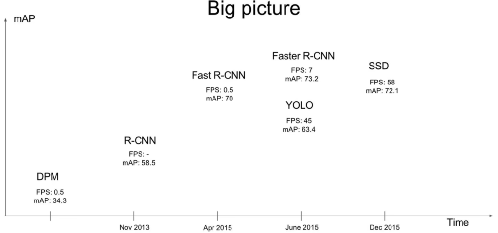 对比其他目标检测方法,在实时目标检测中,YOLO是最准的,在非实时目标检测中,YOLO是最快的。初代版本YOLO的精度位于R-CNN与Fast R-CNN之间,但其速度很快,FPS达到45。