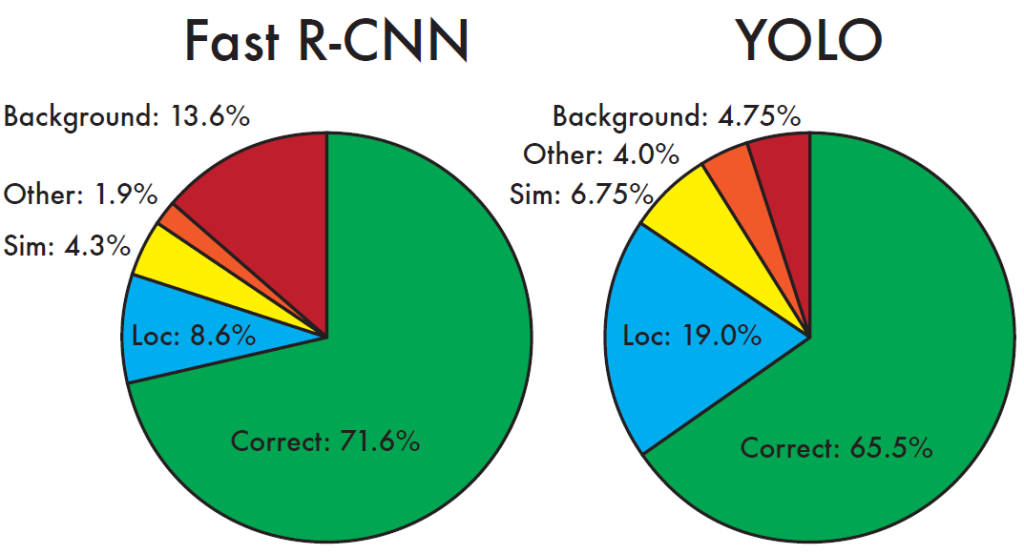 Fast R-CNN只能看到RoI,区分背景能力差,但是精确定位性能好;YOLO能看到全图,区分背景和物体能力强,但精确定位能力差。