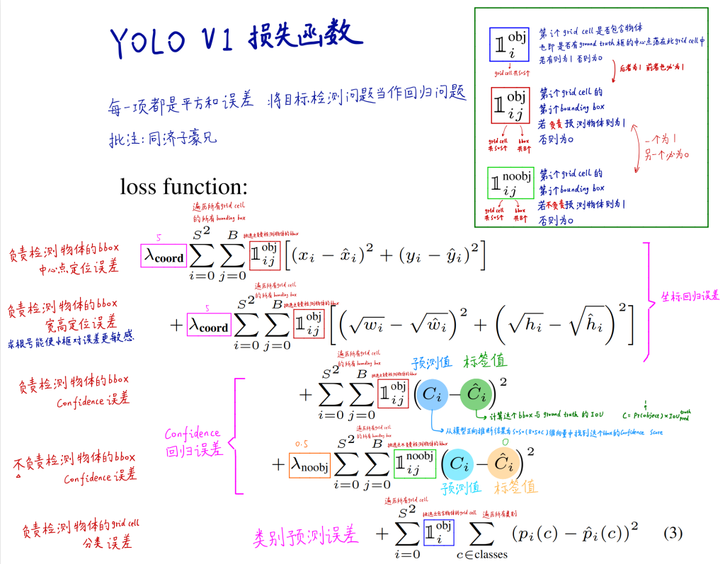 值得注意的是,负责检测物体的$\mathbb{1}^{obj}_{i}$与$\mathbb{1}^{obj}_{ij}$同为0/1,而$\mathbb{1}^{noobj}_{ij}$则相反。